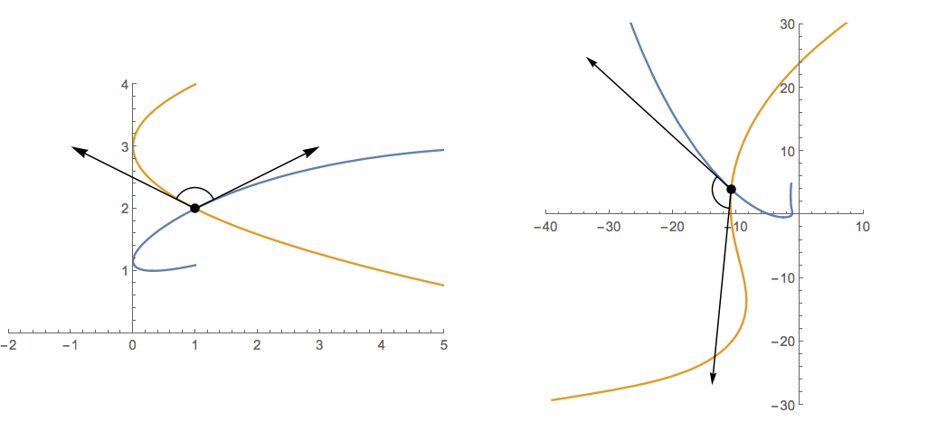 \[\begin{align} \gamma_1(t) &= (t^2+2t+1)+(\sin(t)+2)i \\ \gamma_2(t) &= (t^2-2t+1)+(t+2)i \\ \end{align}\]The paths are pretty much arbitrary, except that \(\gamma_1(0)=\gamma_2(0)=1+2i\). On the right, we apply the (almost completely arbitrary) function \(f(z)=z^3+z^2+\sin (z)\). The angle between the paths where they cross should be preserved.