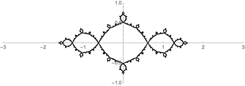 Let's take the squaring family \(f_c(z)=z^2+c\), for example. It's not hard to solve \[w=z^2+c\] for \(z\) to get \(z=\pm\sqrt{w-c}\). This yields two inverse functions \[f^{-1}(z) = \pm\sqrt{w-c}.\] Thus, we expect the Julia set, \(J\) to satisfy an IFS like equation: \[J = \sqrt{J-c} \, \bigcup \, -\sqrt{J-c}.\] I guess it's not exact self-similarity, since the square root function isn't a similarity tranformation - but, it should look close.