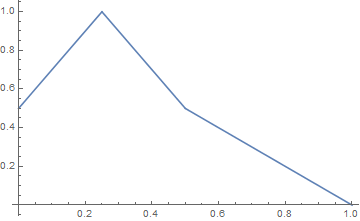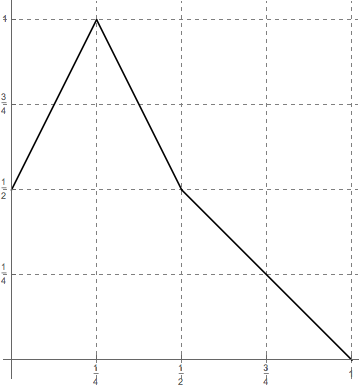 Show that the function [imath]f:[0,1]\to[0,1][/imath] whose graph is shown below has orbits of all even periods but no orbits of any odd period (other than the fixed point at [imath]1/2[/imath]). How does this example fit into the Sharkovsky order?