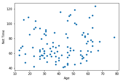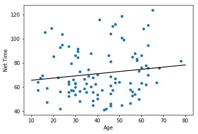 After getting the data, run a linear regression to examine the relationship between Age and Net Time. Answer the following questions: