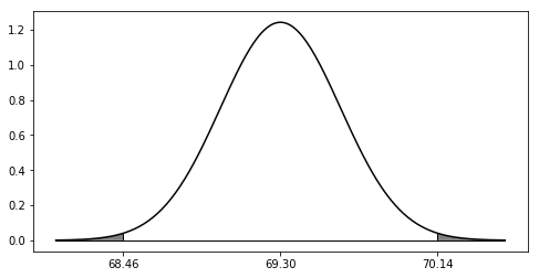 To examine this question, we compute the probability that we could get that computed mean or worse under the assumption of the null hypothesis. Put another way, we need to find the shaded area below where the normal curve has mean $69.3$ and standard deviation $0.3213$ a dictated by the problem.