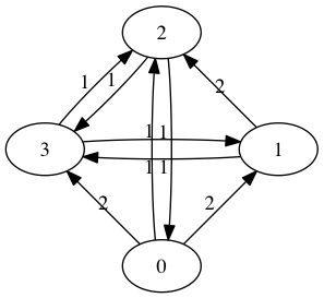 This configuration is called a directed graph or digraph. We construct it by placing an edge from team $i$ to team $j$ and labeling that edge with the number of times that team $i$ beat team $j$. We suppress zero edges. There an obvious matrix associated with a digraph called the adjacency matrix. The rows and column will be indexed by the teams. In row $i$ and column $j$, we place the label on the edge from team $i$ to team $j$. The adjacency matrix for this digraph is