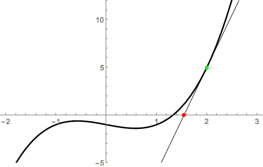 Newton's method works by riding the tangent line from an initial guess. If we note that \(x_1=2\) is pretty close to the root, we compute \(x_2 = N(x_2)\), where \[N(x) = x - \frac{f(x)}{f'(x)} = x - \frac{x^3-x-1}{3x^2-1}.\] Thus, \(x_2 = N(2) = 2-5/11 \approx 1.54545\). Geometrically, this point is obtained by riding the tangent line to the \(x\)-axis: