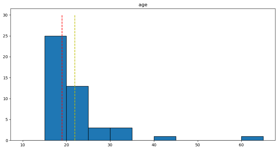 Here’s a histogram for the ages of folks in the class (including me). I’m not at all surprised to see that this is not normally distributed. Note that I’ve marked both the mean (in yellow) and the median (in red).
