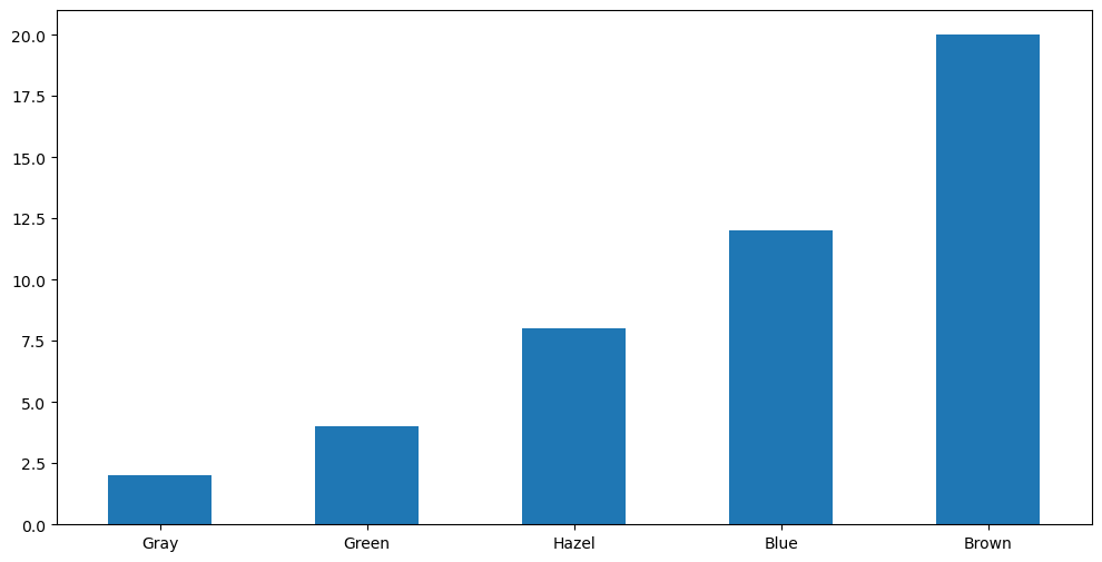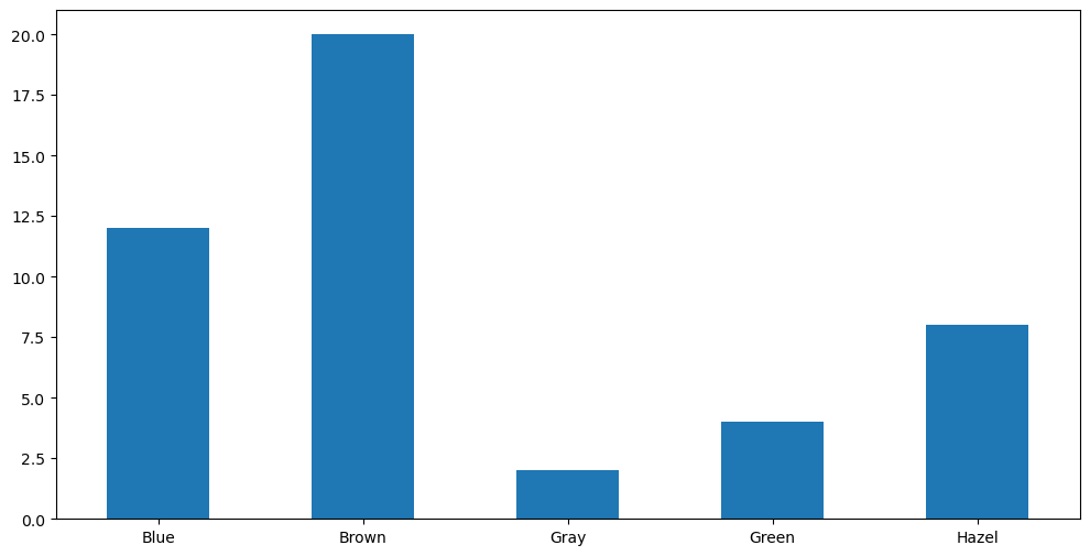 Like a histogram, a bar chart represents value counts with vertical bars. Here’s a bar chart for the different eye colors in the class: