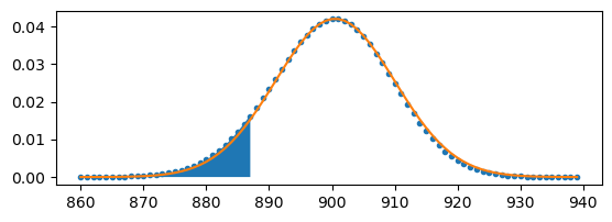 ax.fill_between(xs2,0,norm.pdf(xs2, 900, np.sqrt(90)))