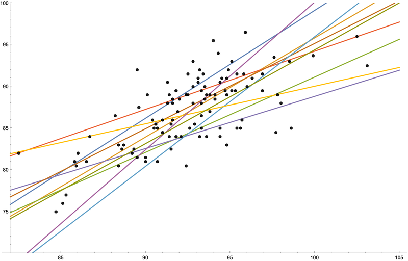 Fiddle with the sliders to select slope and intercept of the red line \(y=mx+c\) and minimize the value of \(T\) shown in the lower right. You should find that the red line needs to match the green regression line to achieve that minimum.