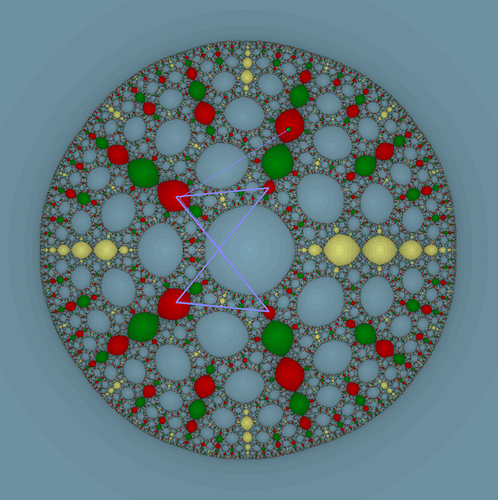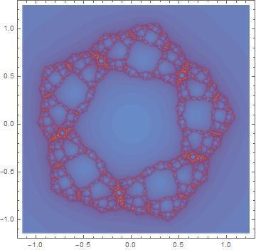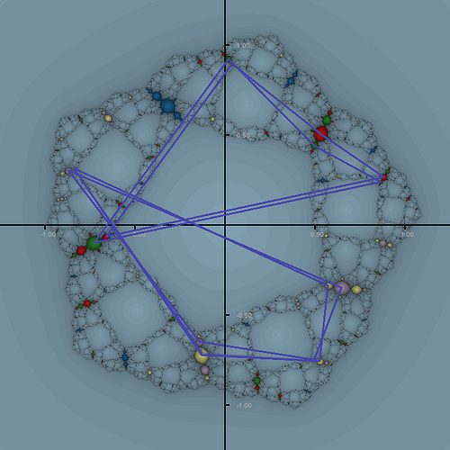 Let us consider $\alpha= -0.110725 - 0.0885781 i$. Plugging this value into our rational julia set tool, we generate the following graphic, which shows some interesting periodic behavior: