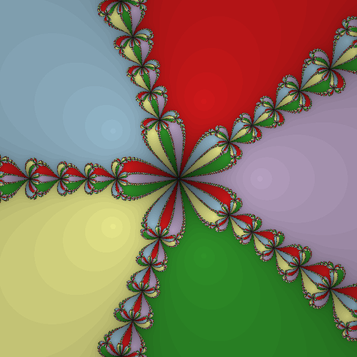 The images below show Julia sets and basins of attraction related to the function $f(z)=z^5-1$. I emphasize related to; the basins of attraction of $f$ are not shown.