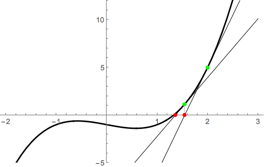 Newton's method works by riding the tangent line from an initial guess. If we note that \(x_1=2\) is pretty close to the root, we compute \(x_2 = N(x_2)\), where \[N(x) = x - \frac{f(x)}{f'(x)} = x - \frac{x^3-x-1}{3x^2-1}.\] Thus, \(x_2 = N(2) = 2-5/11 \approx 1.54545\). Geometrically, this point is obtained by riding the tangent line to the \(x\)-axis: