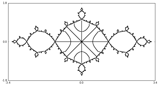 Figure Figure 5.3.3 illustrates a this conjugacy for \(f(z)=z^2-z^4/8\text{.}\) Note that the origin is a super-attracting fixed point - but not the only one. In fact, this map was created expanding \((z^2-1)^2-1\) and then conjugating to force the coefficient of \(z^2\) to be one. Note also that the conjugacy extends only through the immediate basin of attraction of the origin. The curves that we see in side that basin are the inverse images of rays of constant argument.