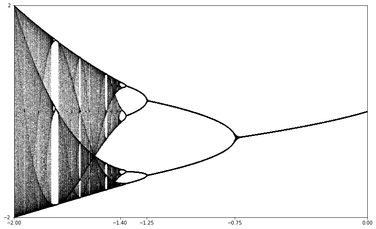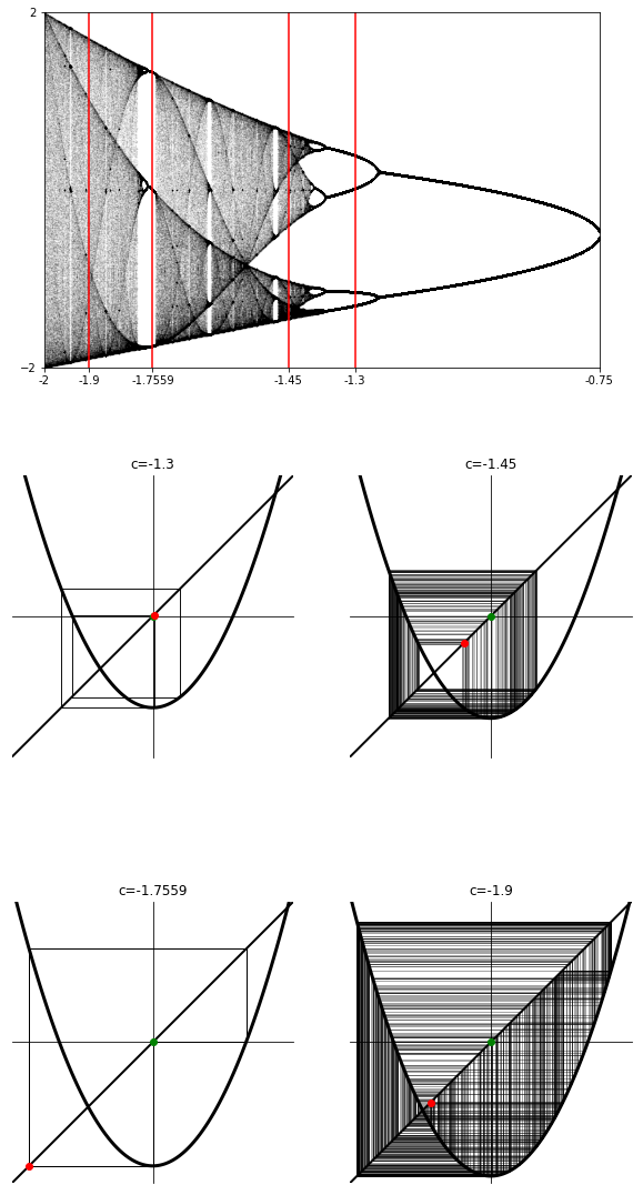 Generally, a bifurcation occurs at a parameter value \(c=c_0\) if the global dynamical behavior of the function \(f_c\) undergoes some qualitative change as \(c\) passes through \(c_0\text{.}\) There are number of different types of bifurcations that can occur, depending on the nature of the qualitative behavior under consideration. The bifurcations that are evident in Figure 2.6.3 in the range \(-1.4 < c < 0\) are called period doubling bifurcations.
