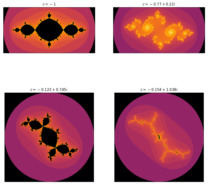 The Mandelbrot set arises in the study of the family of functions \(f_c(z)=z^2+c\text{.}\) If we iterate \(f_c\) for a fixed \(c\text{,}\) we can generate a Julia set. Here are a few examples: