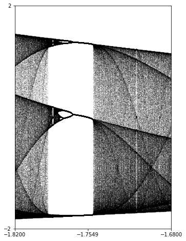 After the overall shape initiated by the period doubling cascade, the most conspicuous structure in the bifurcation diagram is probably the collection of vertical white strips. These correspond to regions where the \(c\) values lead to functions with attractive orbits. The largest such strip is called the period three window and a zoom into the period three window is shown in Figure 2.7.1.