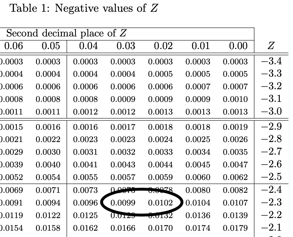 To find $z^*$ for a $98\%$ confindence level, look for $(1-0.98)/2 = 0.01$ in the normal table. It looks like, we get a value between $2.32$ and $2.33$. (Either of those is fine, though I prefer to round up.)