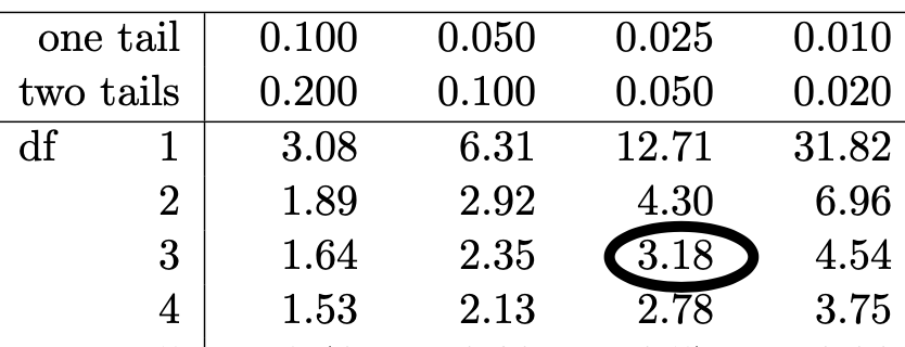 To write down the confidence interval, we'll need a $t^*$ multiplier, which we look up in our $t$-table. We find that for a a two-tailed significance of level of $0.05$, we'll need $t^*=3.18$: