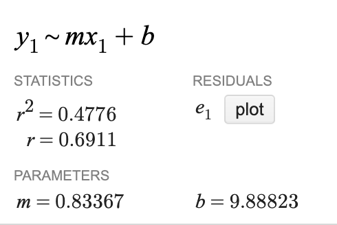 Of particular importance is the correlation $r=0.6911$ and the coefficients $m$ and $b$, which tell us that $$y = 0.8336697990278819x + 9.888233331751707$$