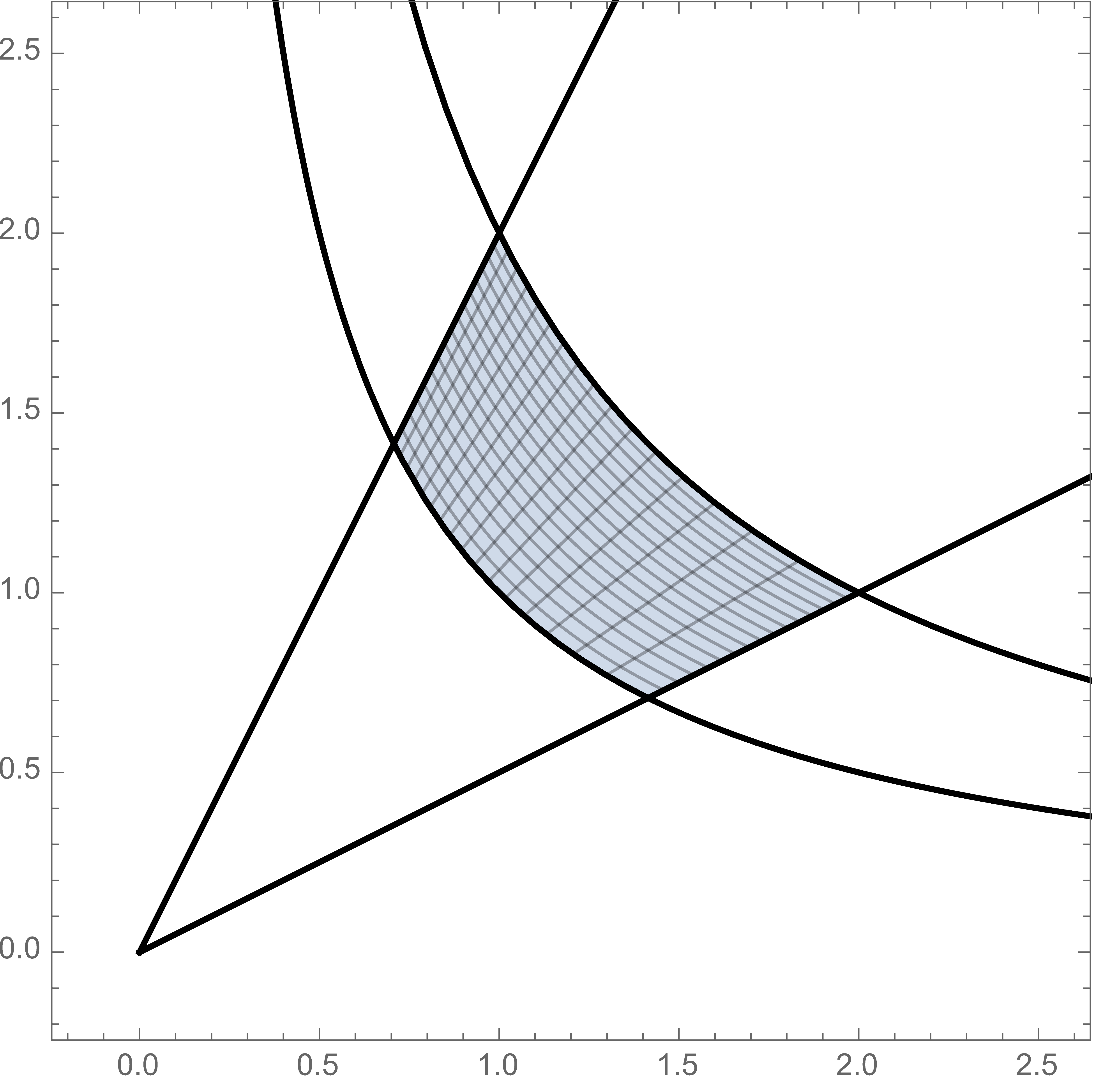 $$\begin{align} \iint_{p} xy \, dA &= \frac{1}{8}\int_0^{8} \int_0^8 \frac{3s+t}{8}\frac{3t+s}{8}\,ds\,dt. \end{align}$$As a final example, let's find the area of the region $R$ bound between the curves $$ y=2x, \: y=\frac{1}{2} x, \: y=\frac{1}{x}, \text{ and } y=\frac{2}{x}. $$