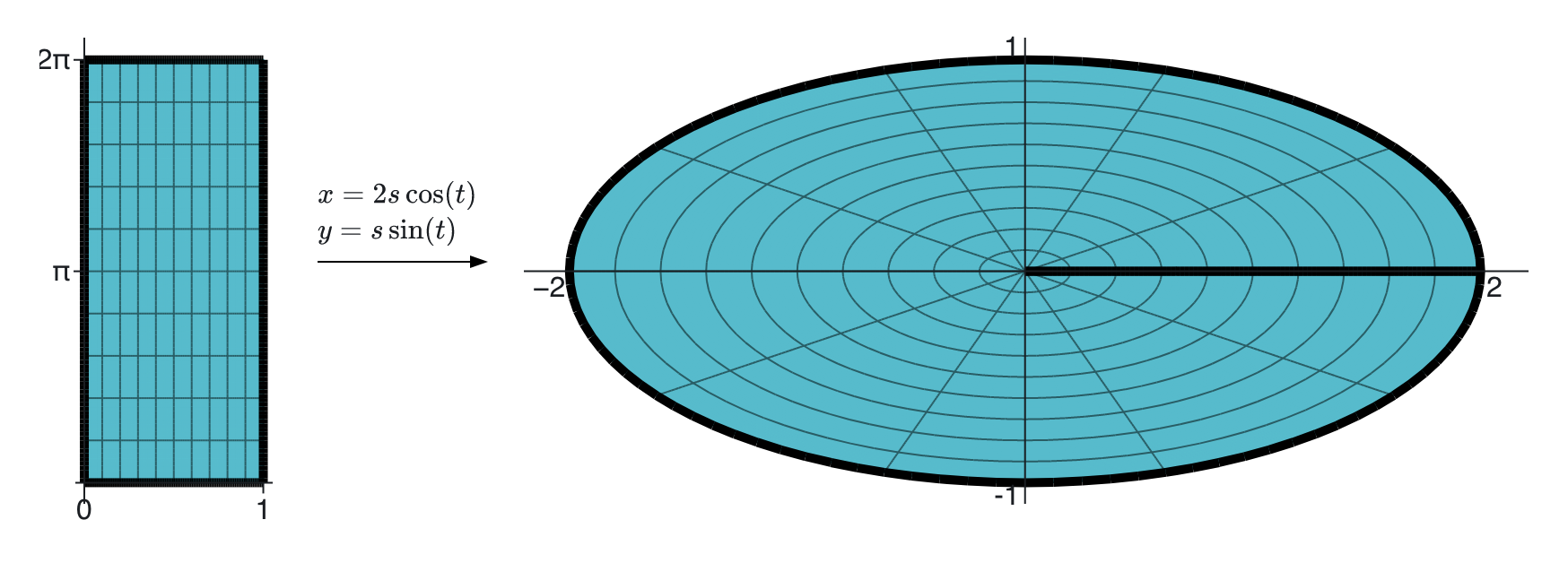 $$\begin{align} x &= 2\,s\cos(t)\\ y &= s\sin(t). \end{align}$$For a fixed value of $s$, these equations parametrize an ellipse that's twice as wide as it is tall. For the set of all values of $s$ from zero to one, we trace out a solid ellipse.