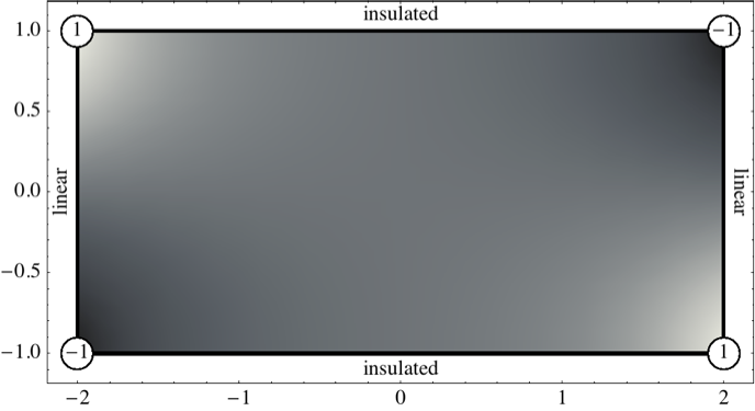 We consider a heat conduction problem on the rectangle \(-2\leq x\leq 2\), \(-1\leq y\leq 1\). The initial temperature distribution is identically zero throughout. At time \(t=0\), the temperature of the vertices are instantly set to either \(1\) or \(-1\) and the edges are either insulated or held at the constant temperature obtained via linear interpolation as indicated in Figure 1. Write down a PDE description of this problem.