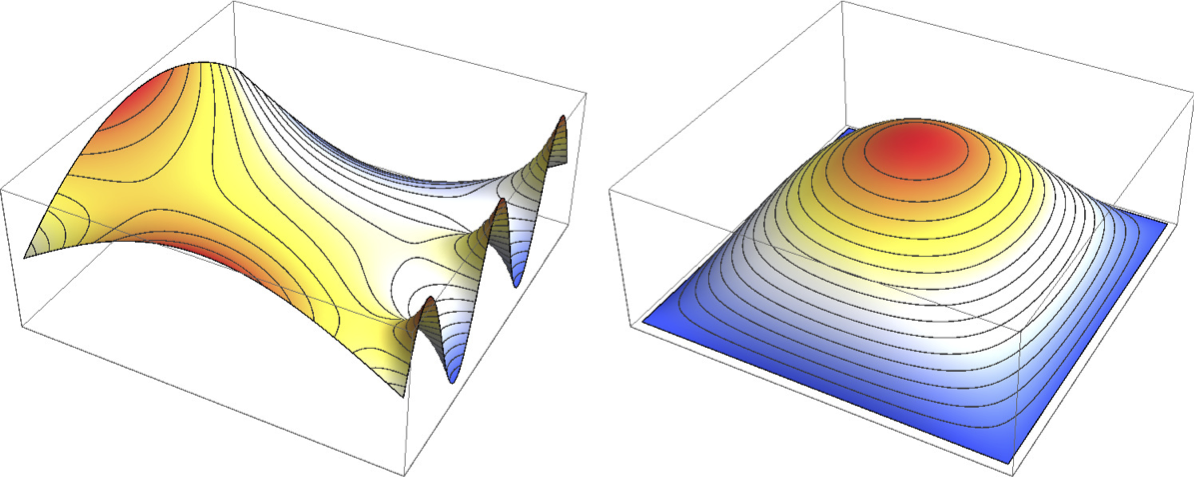 - The figure below shows the graph of two functions on the unit square. Which of these can be a solution of of Laplace’s equation \(\Delta u=0\). You must clearly state a property that \(u\) must satisfy that one graph clearly does not have in order to get full credit.
