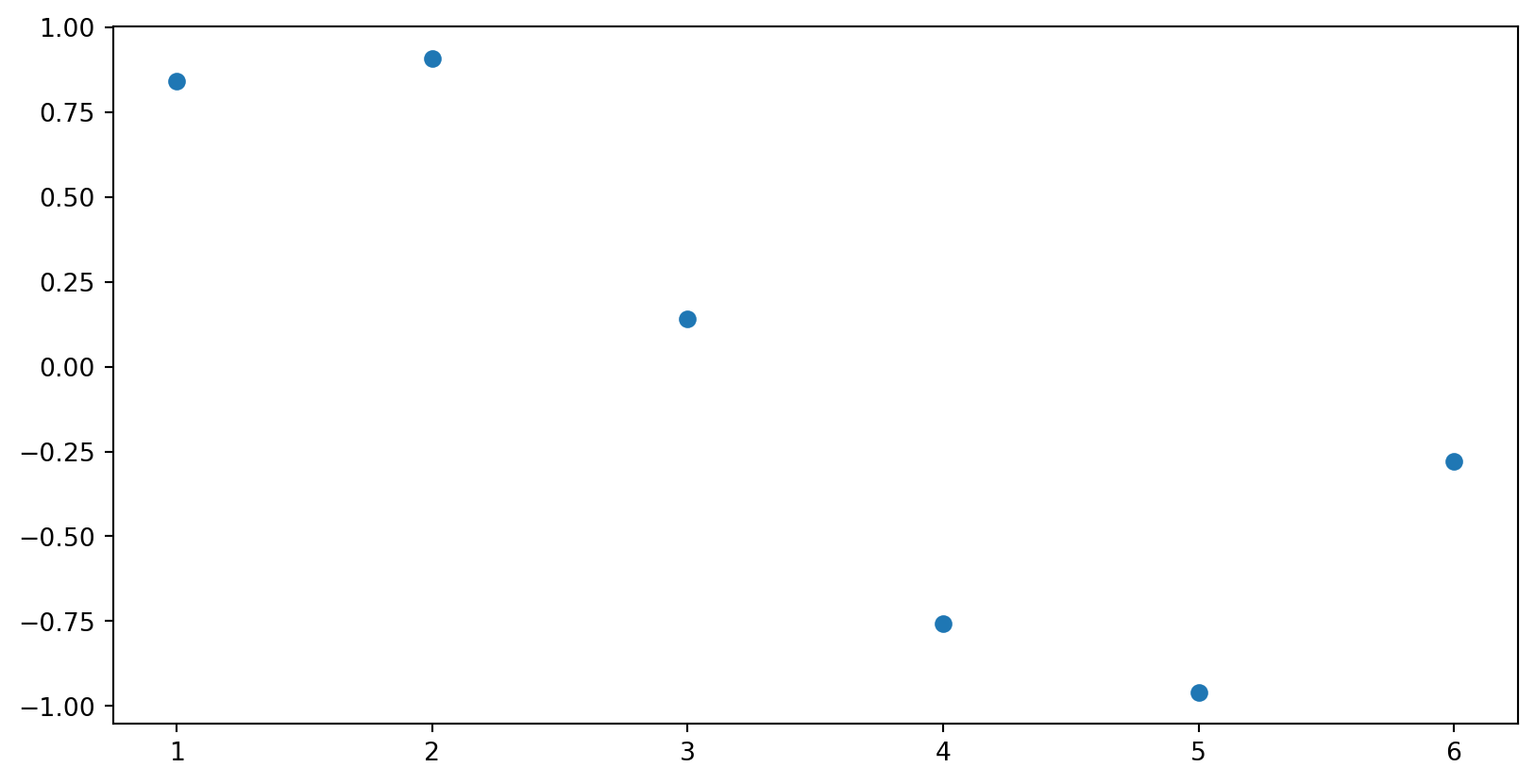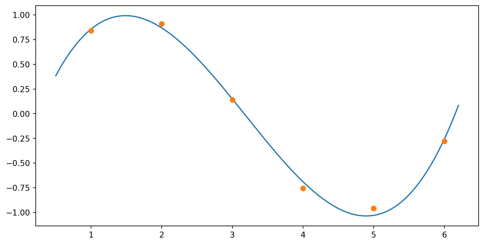 Suppose we wish to the fit points \(\{n, \sin(n)\}_{n=1}^6\), as shown below: