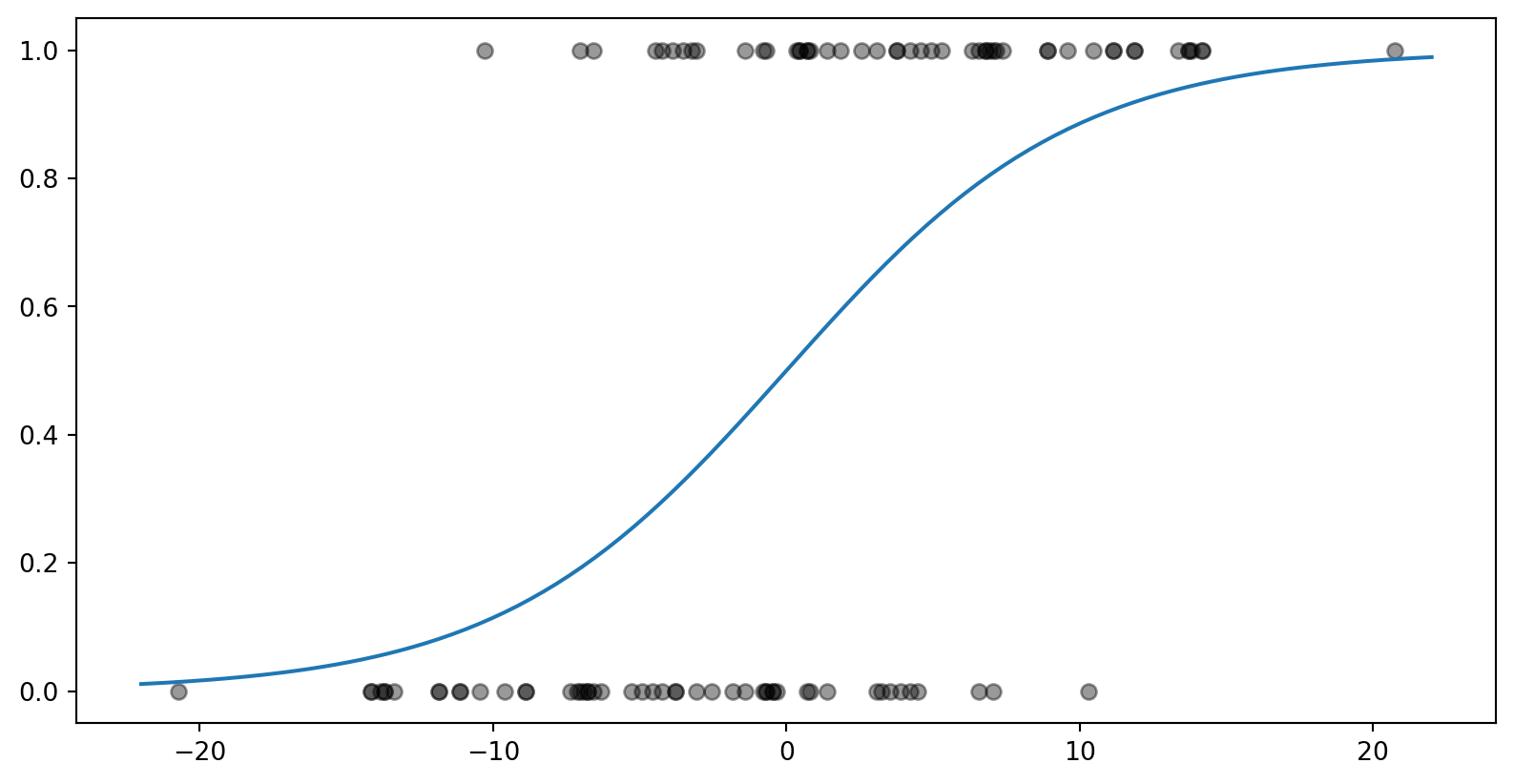 If you take another look at our picture of the logistic curve, you’ll notice that it inherits a symmetry from the data. This symmetry implies that \(b=0\) so that our sigmoid function is a just bit simpler: \[