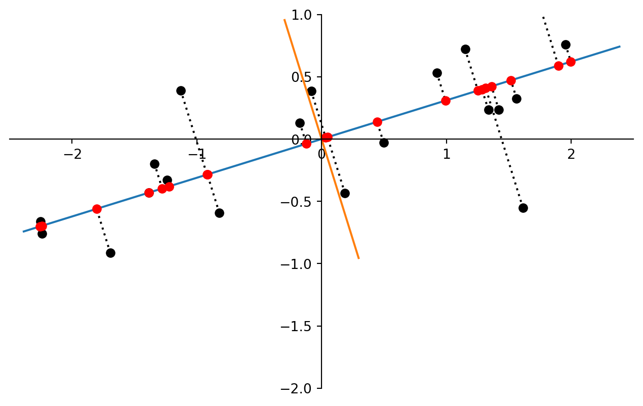 fig = pickle.loads(fig_data)# Project onto first principal component v1def P(x):return (v1.dot(x)/v1.dot(v1)) * v1for [x,y] in centered_data: [xx,yy] = np.array(P([x,y])).T plt.plot([x,xx],[y,yy], 'k', linestyle = (0,(1,2))) plt.plot([xx],[yy], 'or')