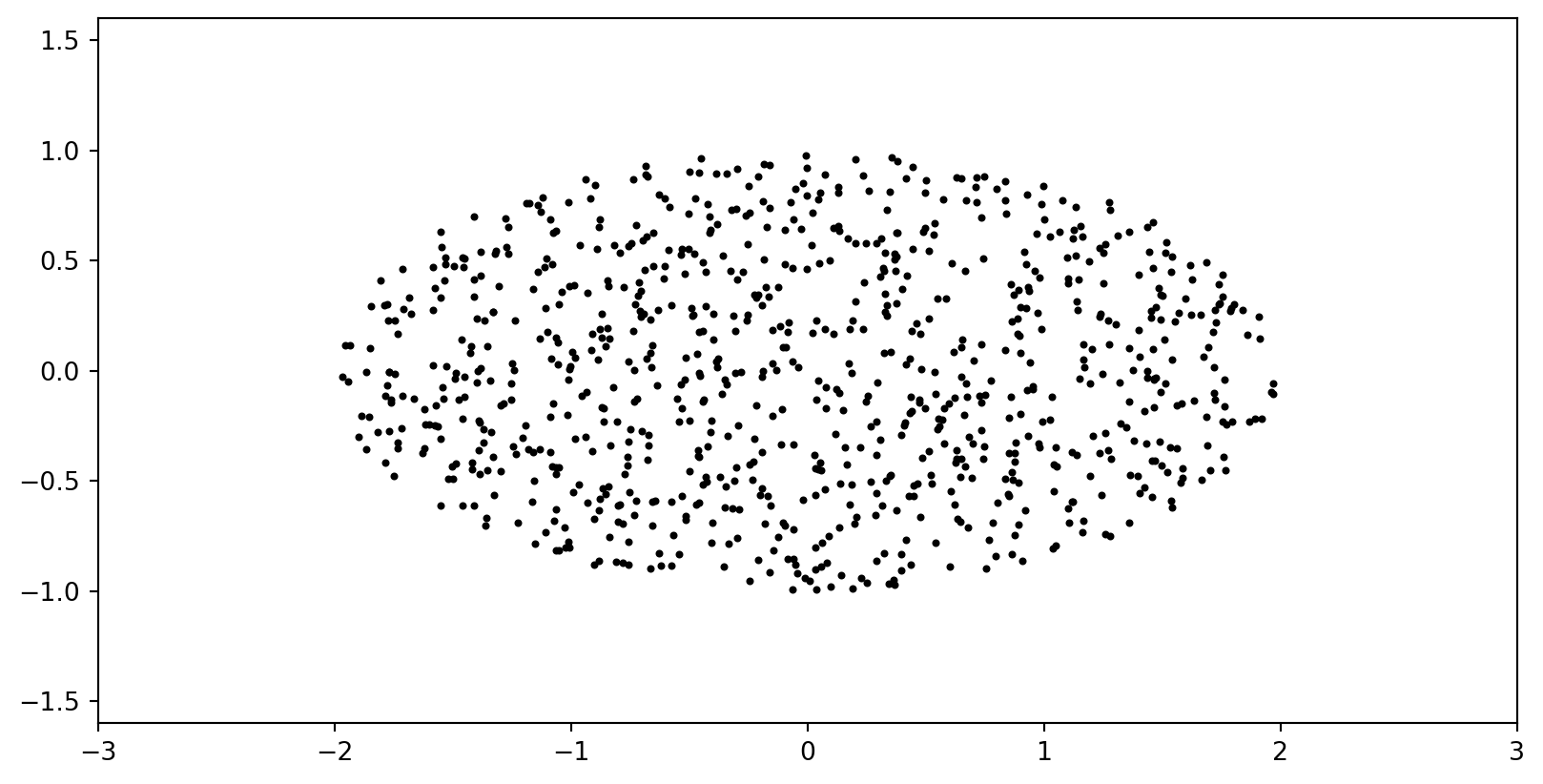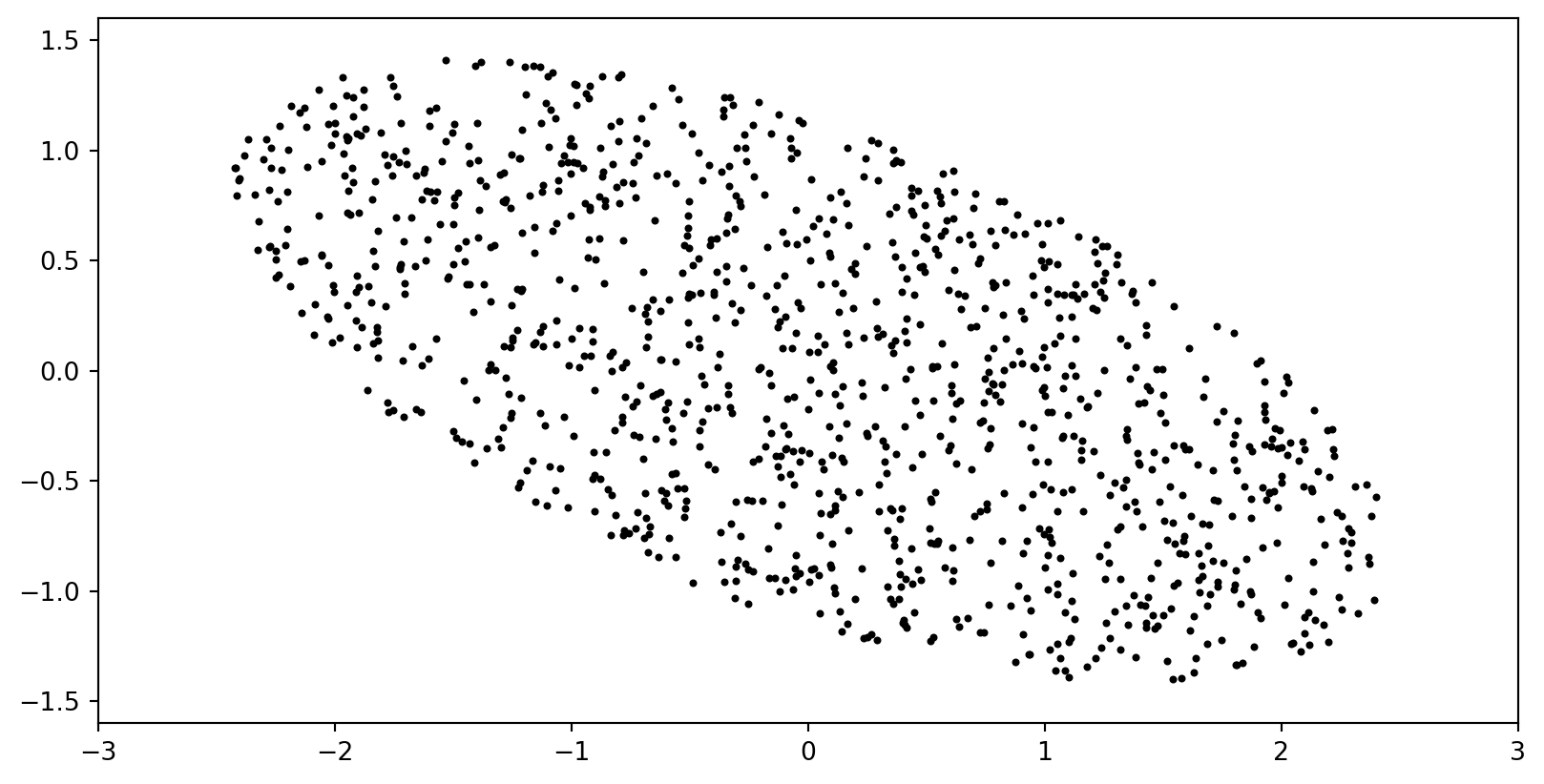 mean = np.mean(data, axis=0)centered_data = data - mean[x,y] = centered_data.Tplt.plot(x,y, 'ok')ax = plt.gca()ax.set_xlim(-2.5,2.5)ax.set_ylim(-2,1)ax.set_aspect(1)fig = plt.gcf()ax.spines['left'].set_position('zero')ax.spines['bottom'].set_position('zero')ax.spines['right'].set_color('none')ax.spines['top'].set_color('none')fig_data = pickle.dumps(fig)