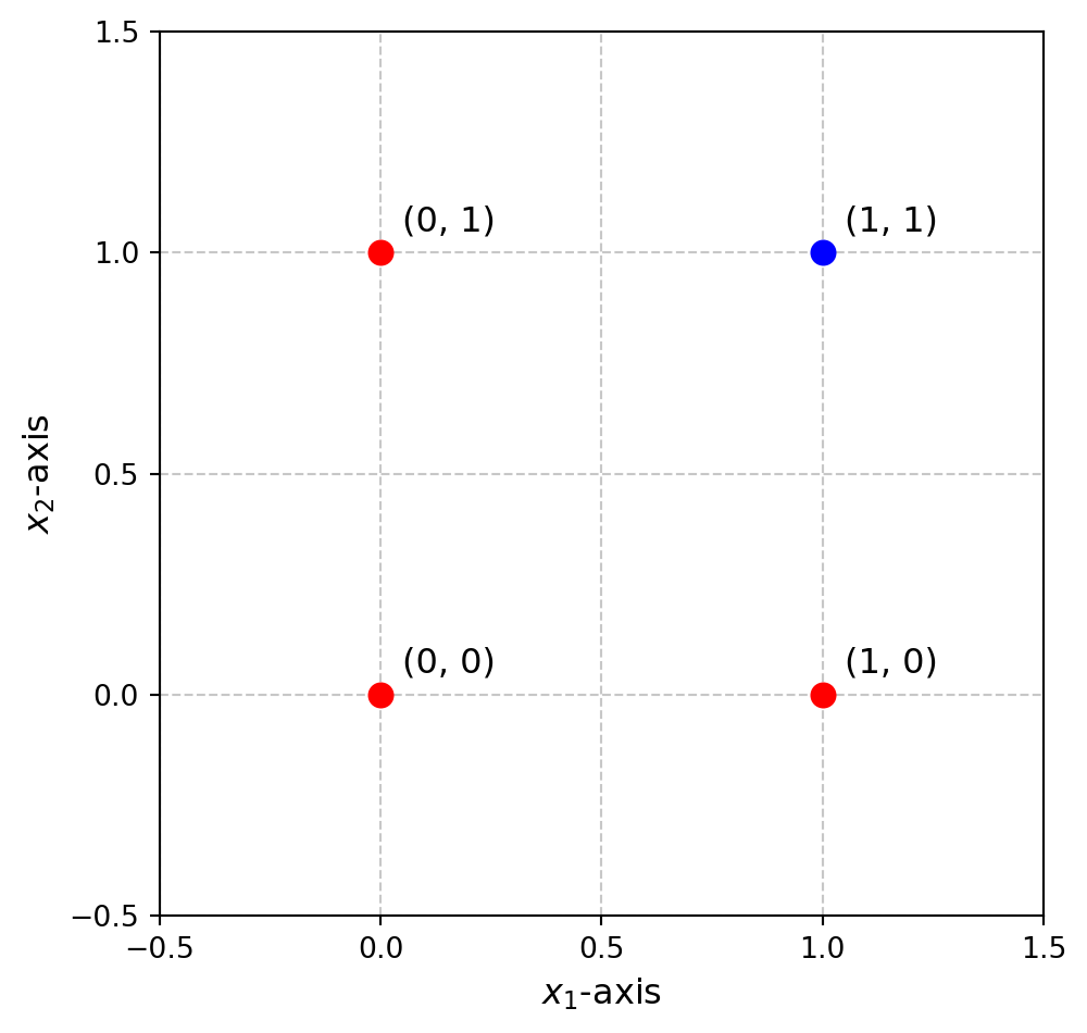 To understand how this classification works (or not), we can draw the points in the input space and color them blue for \(1\) or red for \(0\). Here’s what the picture looks like for the And gate: