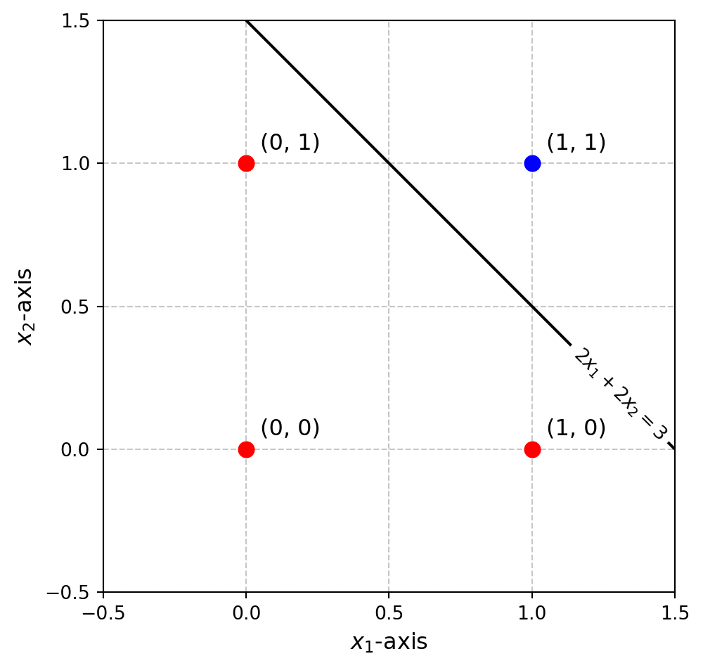 Now, let’s plot those same points together with the line \(2x_1 + 2x_2 = 3\). We can see clearly how that line breaks the set of inputs into the two classifications