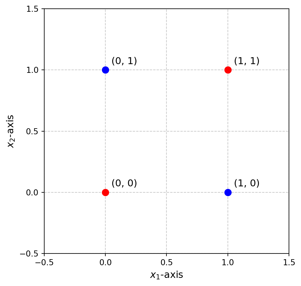 Now, here are the inputs for Xor colored by classification. Do you see the issue?