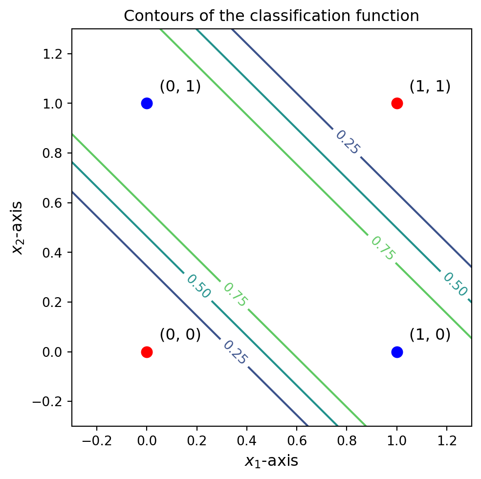 \[\begin{aligned} 0 & \quad \text{ when } y = w_1 \, x_1 + w_2 \, x_2 + w_0 < 0 \text{ and } \\ 1 & \quad \text{ when } y = w_1 \, x_1 + w_2 \, x_2 + w_0 > 0. \end{aligned}\]One way (of many) to pick weights to yield the And gate is \(w_1=w_2=2\) and \(w_0=-3\). We can then compute \[ y = 2 \, x_1 + 2 \, x_2 - 3 \] and classify according to whether \(y<0\) or \(y>0\). To see this in action is a simple matter of plugging in: \[ \begin{aligned} y(1,1) &= 1 > 0 \implies \text{output} = 1 \\ y(1,0) &= -1 < 0\implies \text{output} = 0 \\ y(0,1) &= -1 < 0 \implies \text{output} = 0 \\ y(0,0) &= -3 < 0\implies \text{output} = 0. \\ \end{aligned} \]