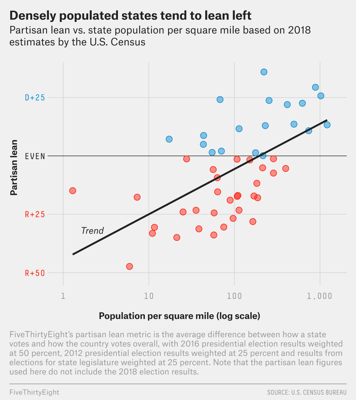 As another example, here's a comparison between population density and partison lean from FiveThirtyEight: